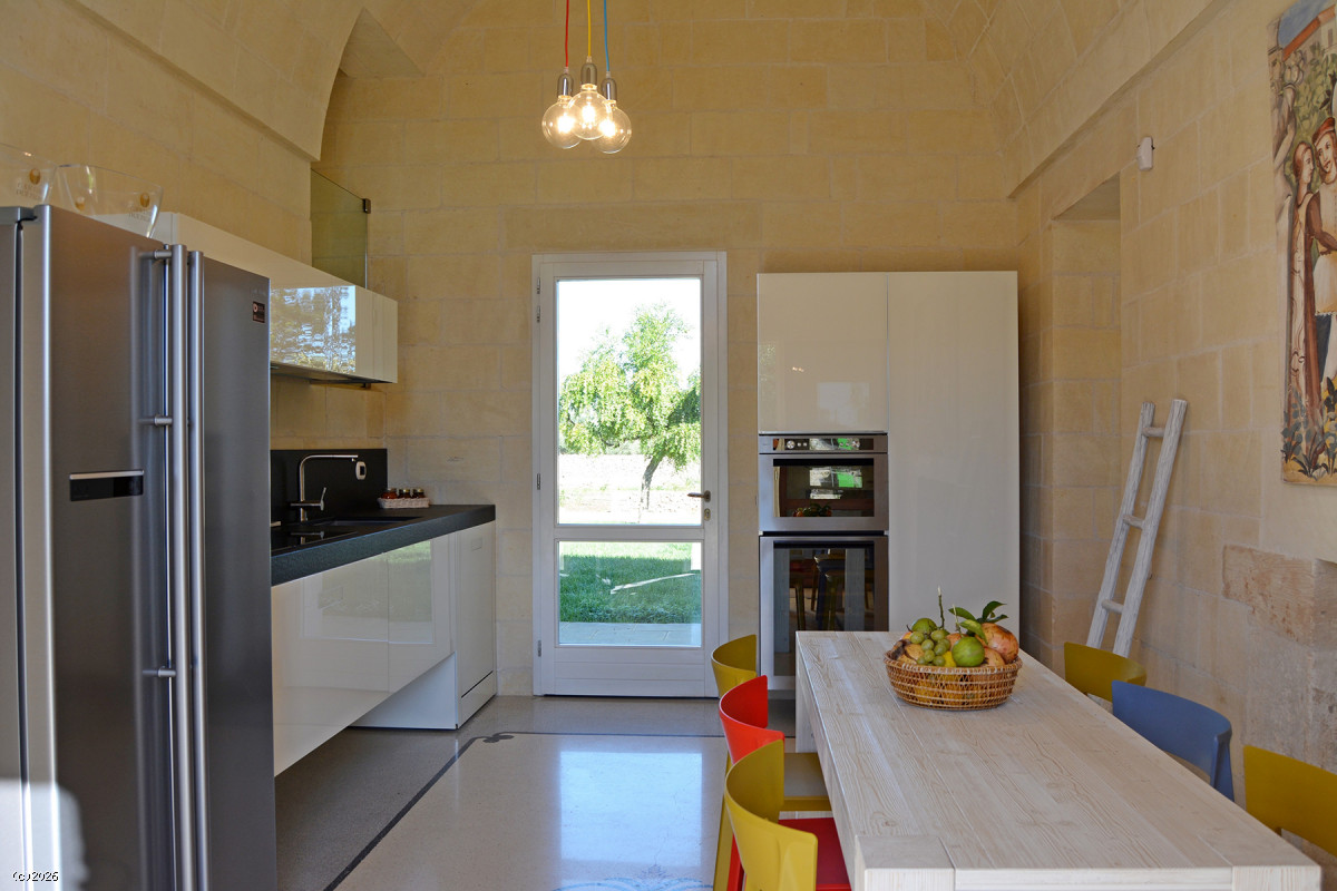 Guests can relax in the lounge area with sofas and TV or make use of the shared kitchen. The property is perfect for those looking to rent a villa with a pool in Salento without compromising on comfort and elegance.