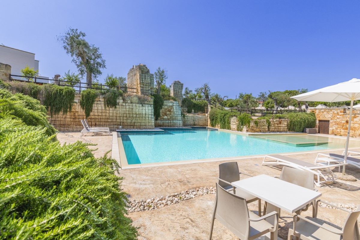 Dal giardino, un cancello privato consente agli ospiti di accedere ai servizi del Cava Li Santi Residence: piscina a bordo sfioro di 18x11 metri con lettini e docce esterne, area relax, zona barbecue attrezzata, lavanderia comune, reception, cancello automatico, area giochi per bambini, biciclette, ping pong e calciobalilla. La dimora è completamente recintata e videosorvegliata, garantendo sicurezza e tranquillità.