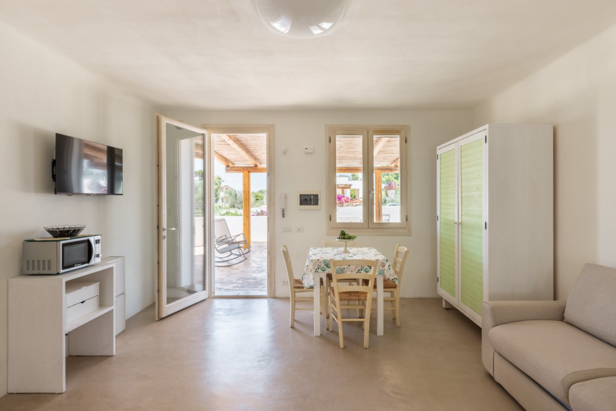 Gli spazi sono ampi e luminosi, arredati con gusto contemporaneo e curati nei dettagli per offrire il massimo comfort. L’appartamento dispone di una camera matrimoniale, un soggiorno con divano letto matrimoniale, angolo cottura attrezzato e bagno privato con doccia. La veranda privata, arredata con tavolo, sedie e amaca, è ideale per colazioni all’aperto o serate sotto le stelle, immersi nel verde e nella tranquillità del residence.