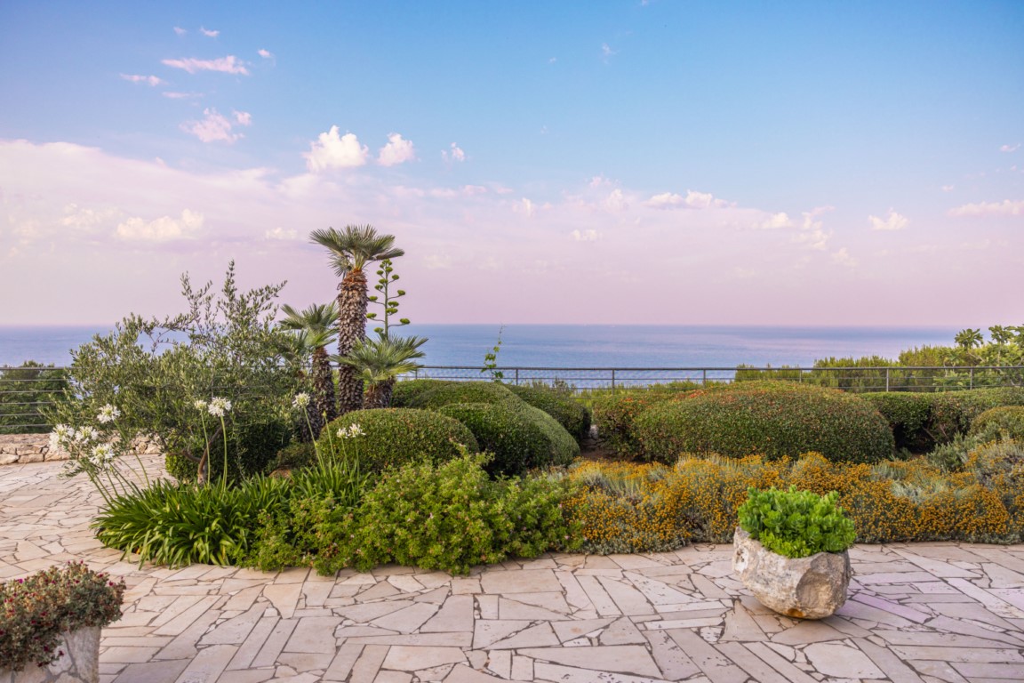 L’appartamento offre una zona giorno con salone e divanetti affacciati sulla piscina e sul mare, una cucina a vista in muratura completamente attrezzata con lavastoviglie e una sala da pranzo ideale per momenti conviviali. Sono presenti due bagni completi e una veranda esterna arredata con divanetti, perfetta per godersi il panorama e il clima mediterraneo.