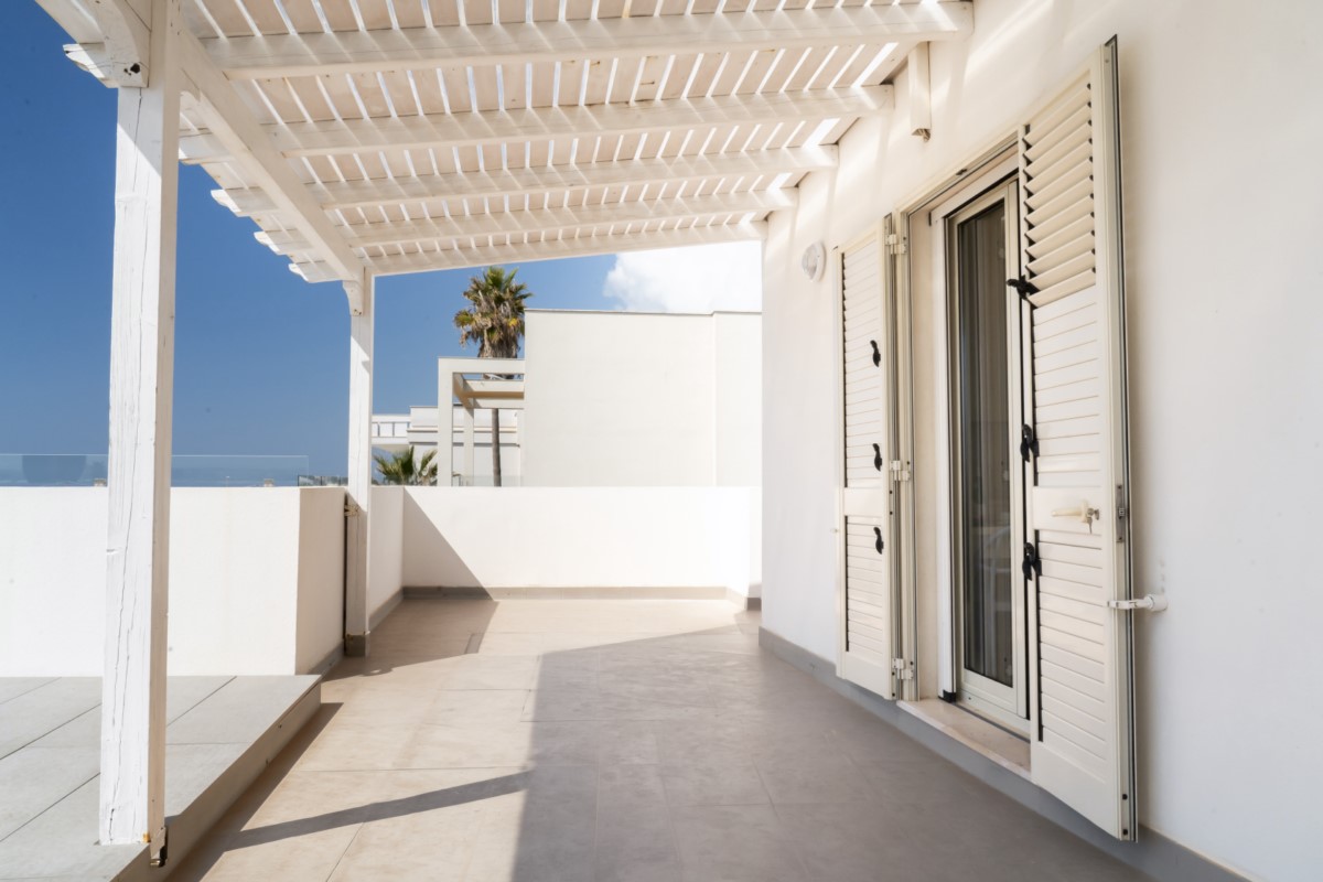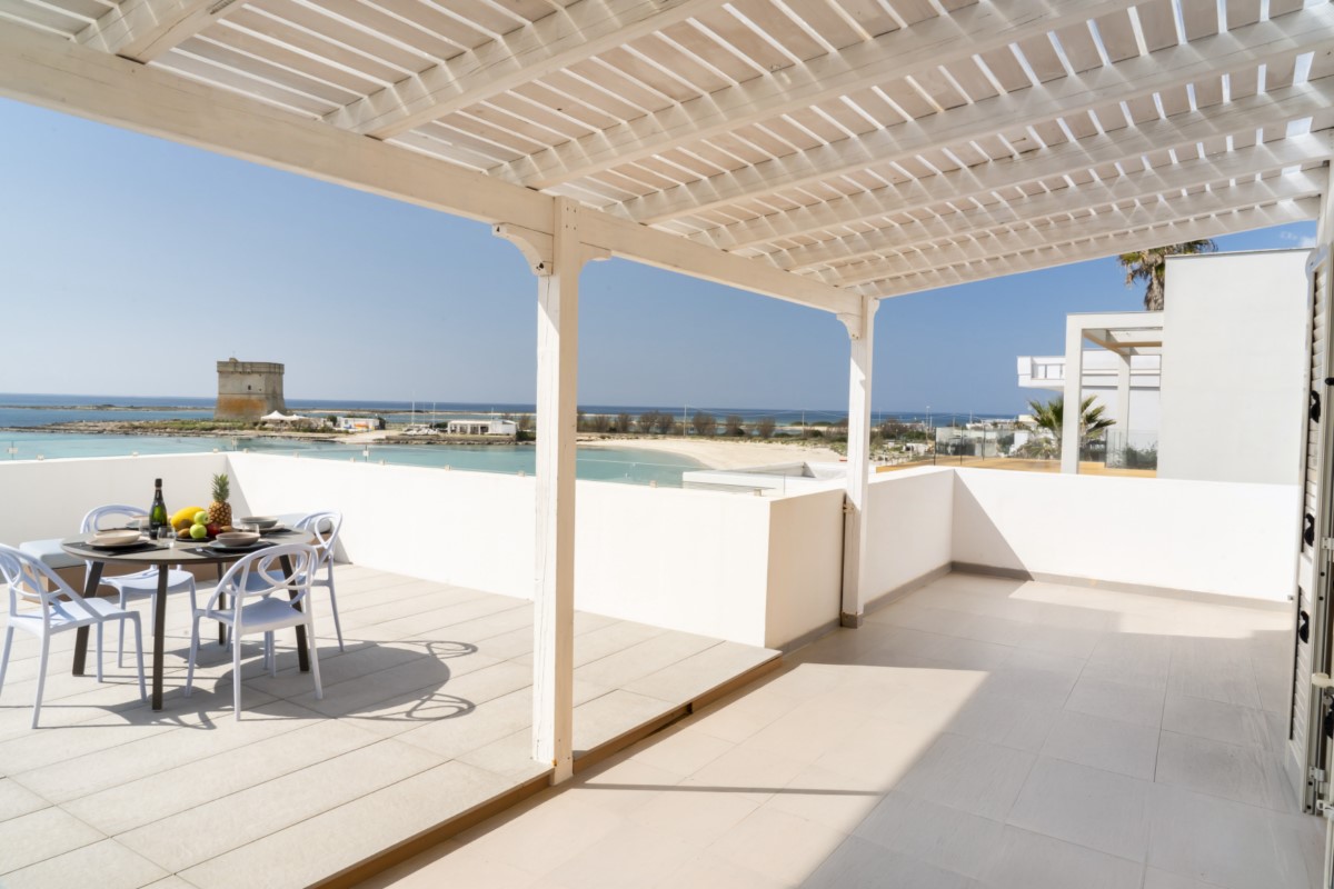 La casa Vacanza dispone di una splendida terrazza vista mare in parte coperta, arredata con tavolo, sedie e sdraio, affacciata direttamente sulla spiaggia di Torre Chianca.