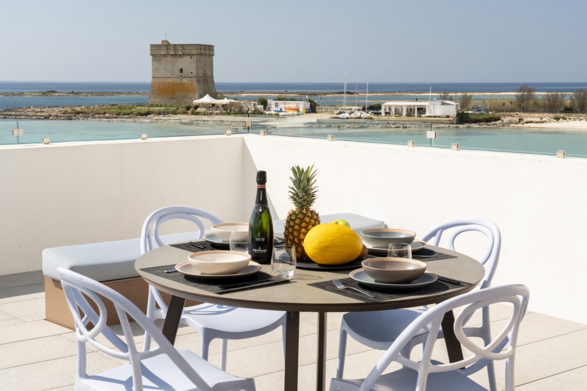 Marina Solea è una splendida casa vacanze vista mare mare, situata all’interno dell'esclusivo Residence Tabù con accesso diretto alla spiaggia di Torre Chianca, una delle più belle e rinomate spiagge del Salento.