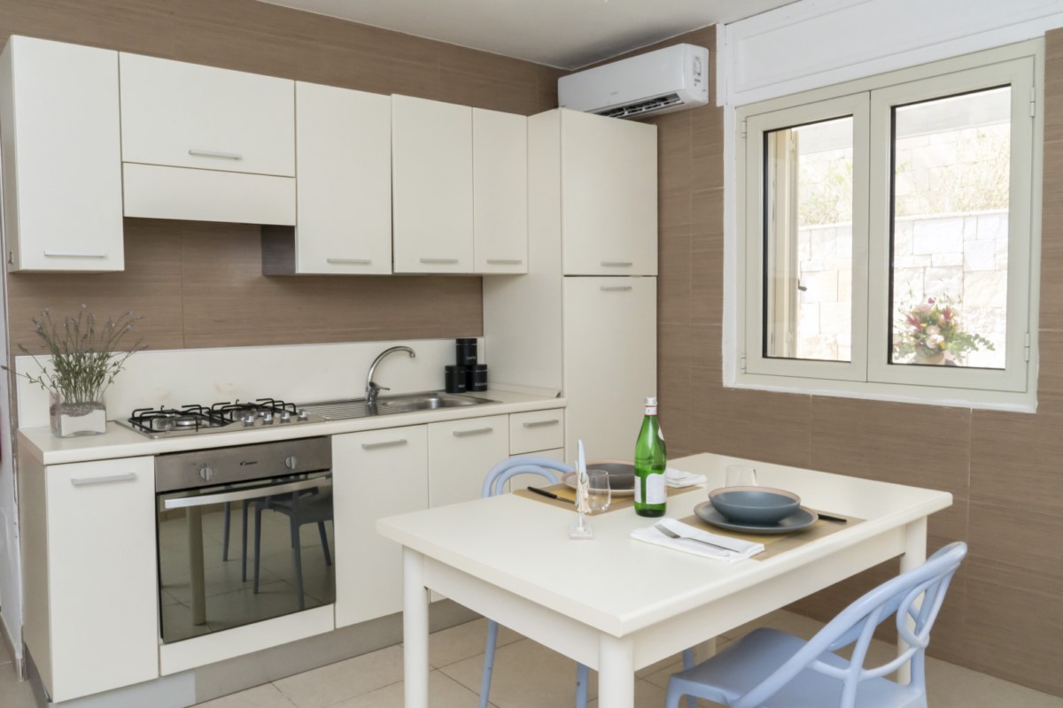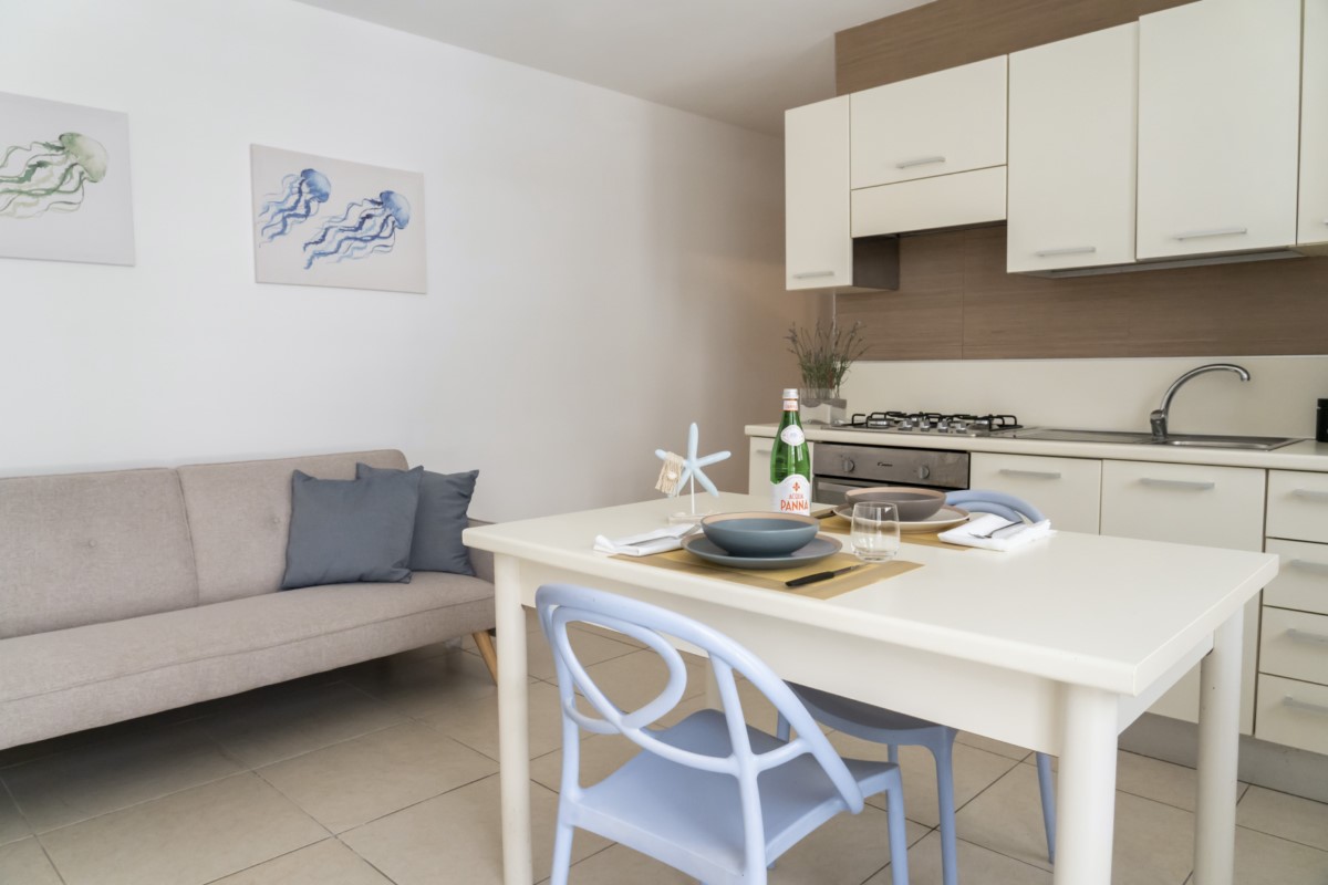 Zona giorno con sala da pranzo, cucina attrezzata e divano letto singolo