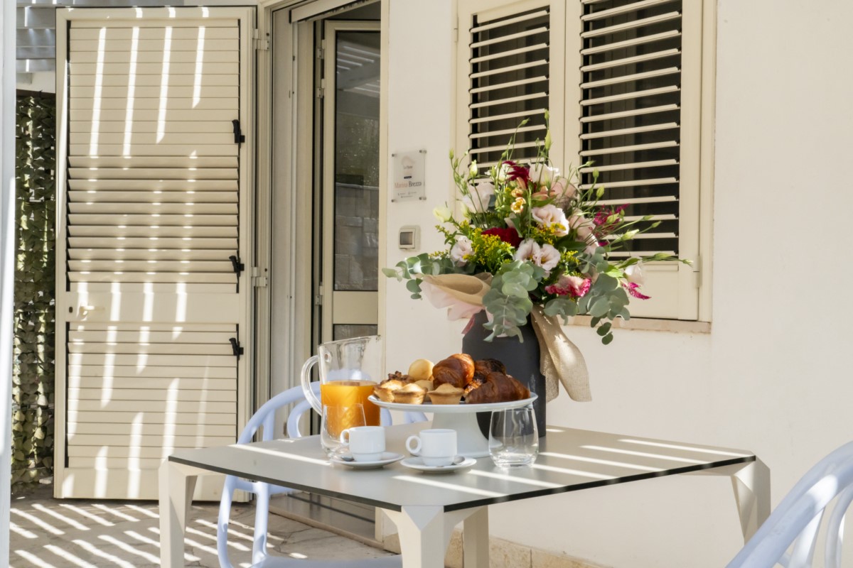 La casa Vacanza dispone di veranda esterna arredata con tavolo e sedie, a pochi passi dalla spiaggia di Torre Chianca.