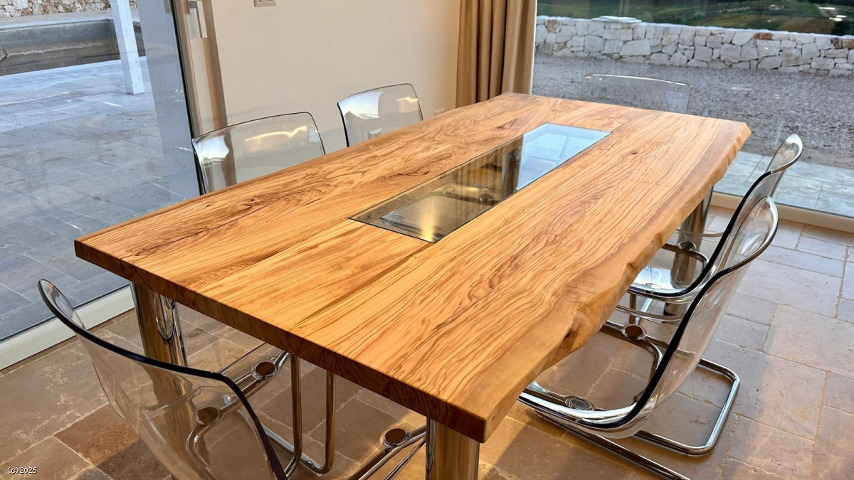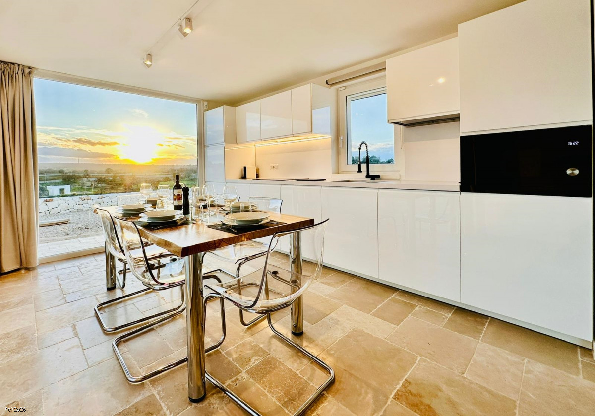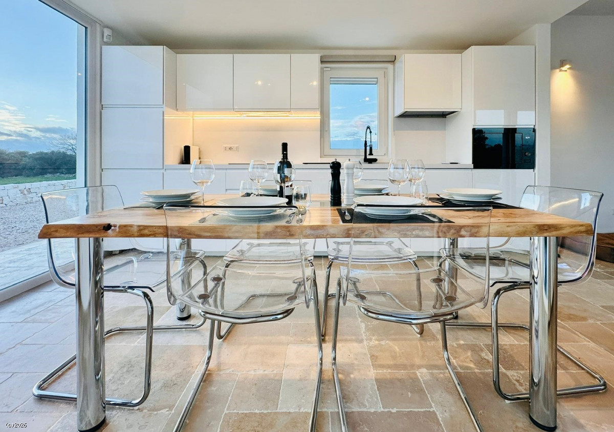La zona giorno è ampia e luminosa, con grandi vetrate che offrono una splendida vista sul paesaggio circostante e sulla piscina esclusiva. La cucina a vista, moderna e completamente attrezzata, permette di preparare facilmente piatti a base di pesce fresco o carne locali, aperitivi o cene conviviali. La cucina è gas-free, con fuochi ad induzione per cucinare con semplicità e sicurezza. Ampio corredo di attrezzatura e stoviglie, dal multipimer a flute e secchiello per champagne.