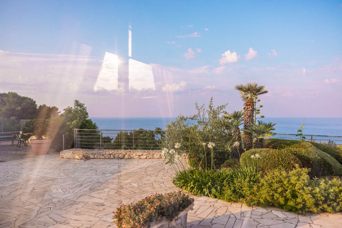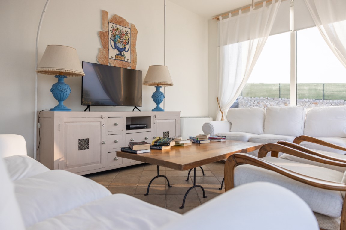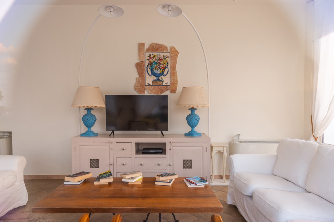 - Riposo del Guerriero: cucina a vista, salone con divanetti affacciati sulla piscina e sul mare, 2 camere, 2 bagni e veranda panoramica.