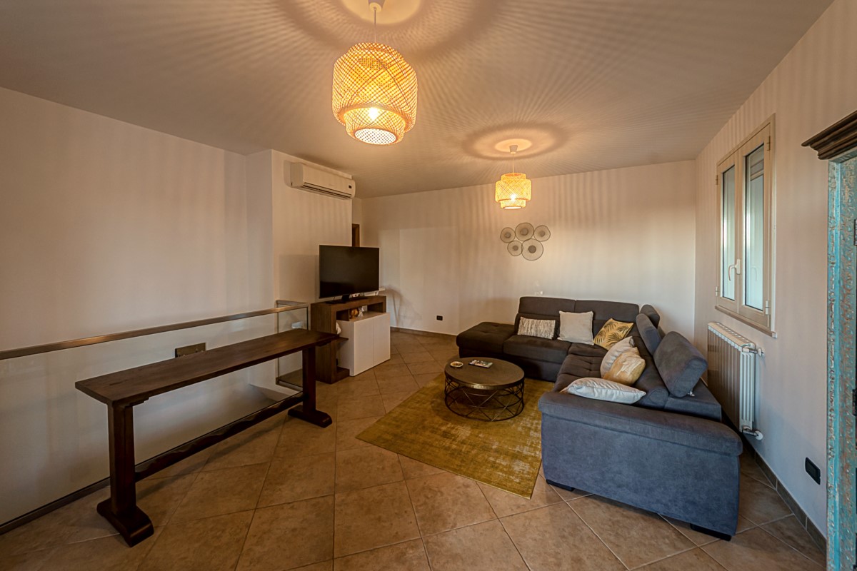 - Soggiorno luminoso con divano e TV, perfetto per momenti di relax dopo una giornata al mare;