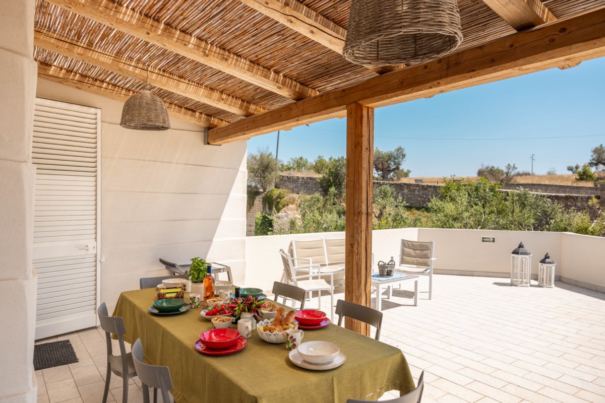 Ambienti luminosi, stile mediterraneo essenziale, materiali naturali: la villa accoglie fino a 7 persone in spazi comodi e ben organizzati.